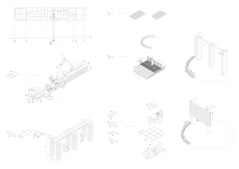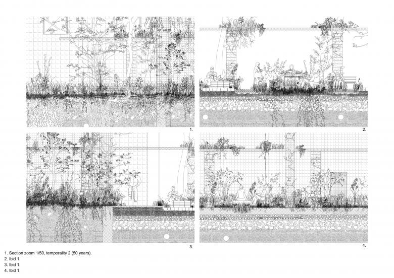 The interventions rely on the selective dismantling of façades and pavement to implement a system for collecting and redistributing rainwater. This system, composed of a network of swales and aqueducts made from repurposed materials, enhances water management, enables controlled material degradation, and fosters the emergence of evolving landscapes.