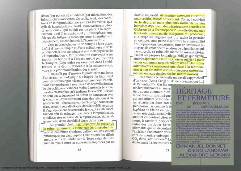 Dismantling means reclaiming its ""negative commons,"" listing them, consolidating them, caring for them, learning to ""live in the ruins of capitalism."" (Anna L. Tsing, 2015. ""The Mushroom at the End of the World"" )