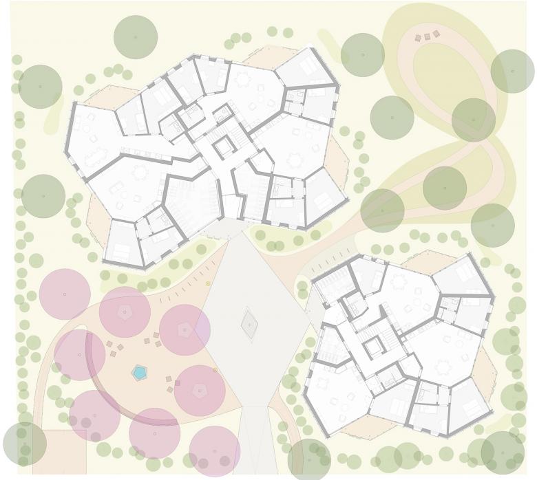 Die beiden Ersatzneubauten für 35 Wohnungen befinden sich in Zürich-Affoltern, im Übergang zwischen Stadt und Landschaft. Diese besondere Lage am Siedlungsrand spiegelt sich sowohl in der Setzung, dem Gebäudeausdruck, als auch der Gestaltung des umfliessenden Grüns wider. Die Umgebungsgestaltung orientiert sich an dieser Dualität, indem Blumenwiesen, Ostbäume und ein üppig-wilder Schmetterlingsgarten von der Naturseite im Norden um die Gebäude herum in die Siedlung hineinfliessen, während sich gleichzeitig die beiden Gebäude auf ihrer dem Siedlungsraum zugewandten Südseite um einen klar gestalteten Gemeinschaftsplatz gruppieren. Dieser Platz bildet im übergeordneten siedlungsinternen Kontext der Baugenossenschaft zugleich Abschluss, als auch Höhepunkt einer sonst gassenartig gestalteten Siedlungsumgebung. Unter einem geometrischen Baumkörper aus fröhlich blühenden Judasbäumen laden eine grosszügige Rundbank, sowie ein plätscherner Brunnen zu gemeinschaftlichen Treffen & lebendigem Miteinander ein. Hat man einmal genug vom Trubel, so kann man sich unbemerkt in den ruhigen, zur Landschaftsseite ausgerichteten und mit blühenden einheimischen Wildstauden bepflanzten Schmetterlingsgarten zurückziehen und lustwandelnd zusammen mit den Schmetterlingen wie auf Wolken träumen oder einfach nur in Ruhe ein Buch im Grünen lesen.