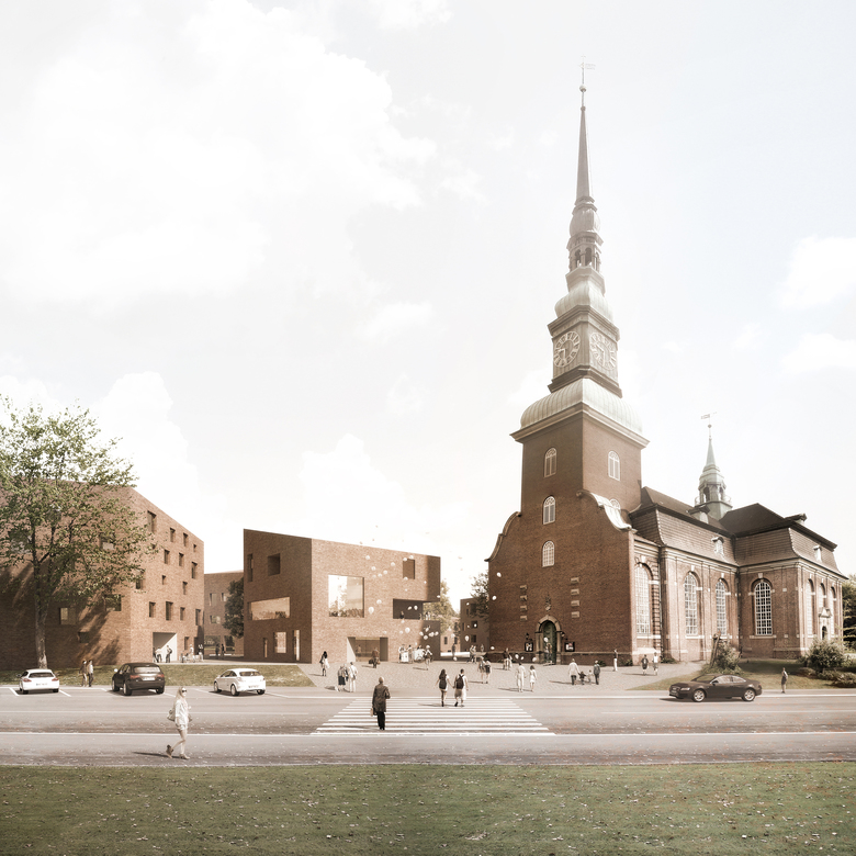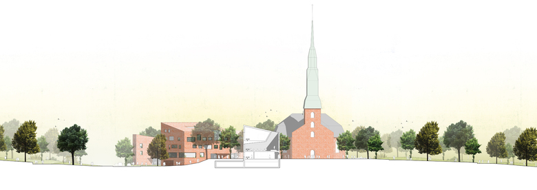 Die Kirche mit ihren Schmuckelementen und der lebhaften Ziegelmaterialität bildet den eindeutigen Hauptpunkt. Die neuen kubischen Baukörper entsprechen einer eher archaischen Grundform (Haus mit Dach) und treten nicht in Konkurrenz zur Kirche. Über das Material roter Ziegel wird die Zusammengehörigkeit betont.