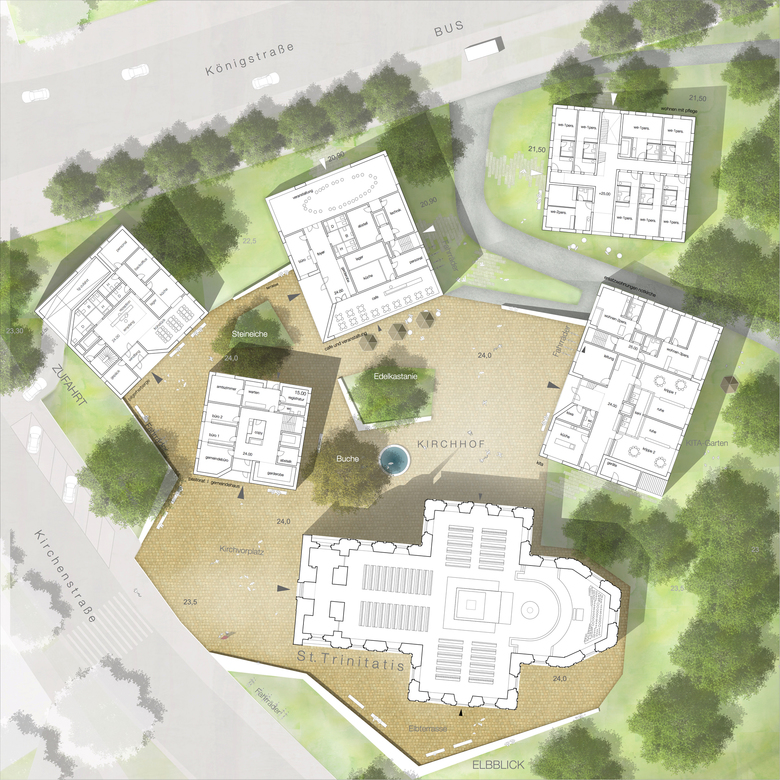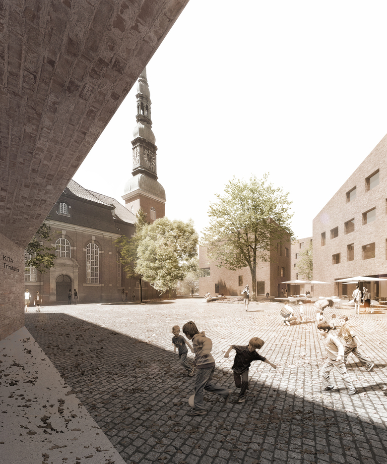 Das Haus für die Kinder und für die erweiterten Ersatzwohnungen bildet den östlichen Abschluss des Ensembles und wird entsprechend der Sichtbeziehung von der Königstraße zum Nordportal der Kirche weiter in den Grünzug positioniert. Die Freiflächen für die Kinder bilden weiterhin den Übergang zum Grünzug.