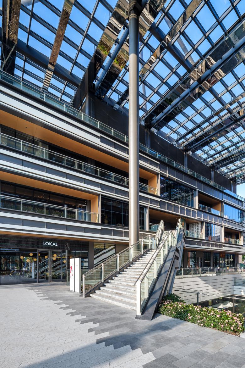 Housing offices, retail, and F&B outlets, as well as a massive equipment zone, the four-storey side building sits alongside 42-floor office tower by Fosters + Partners. To create visual consistency, Kokaistudios incorporated into the smaller building elements of its taller counterpart's form, as well as the verticality of the nearby commercial space by way of soaring pillars plus staircases that extend thorough the space. The building further connects to its surroundings through two distinct facades on its east and west side respectively.