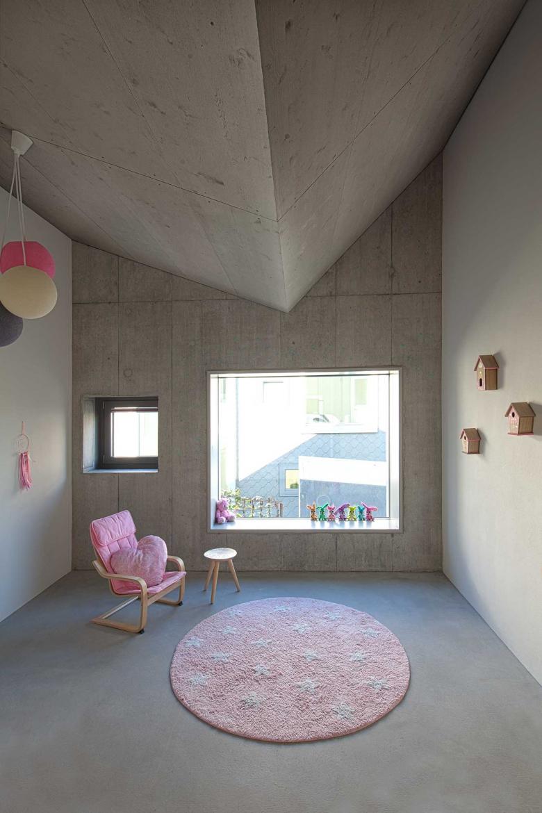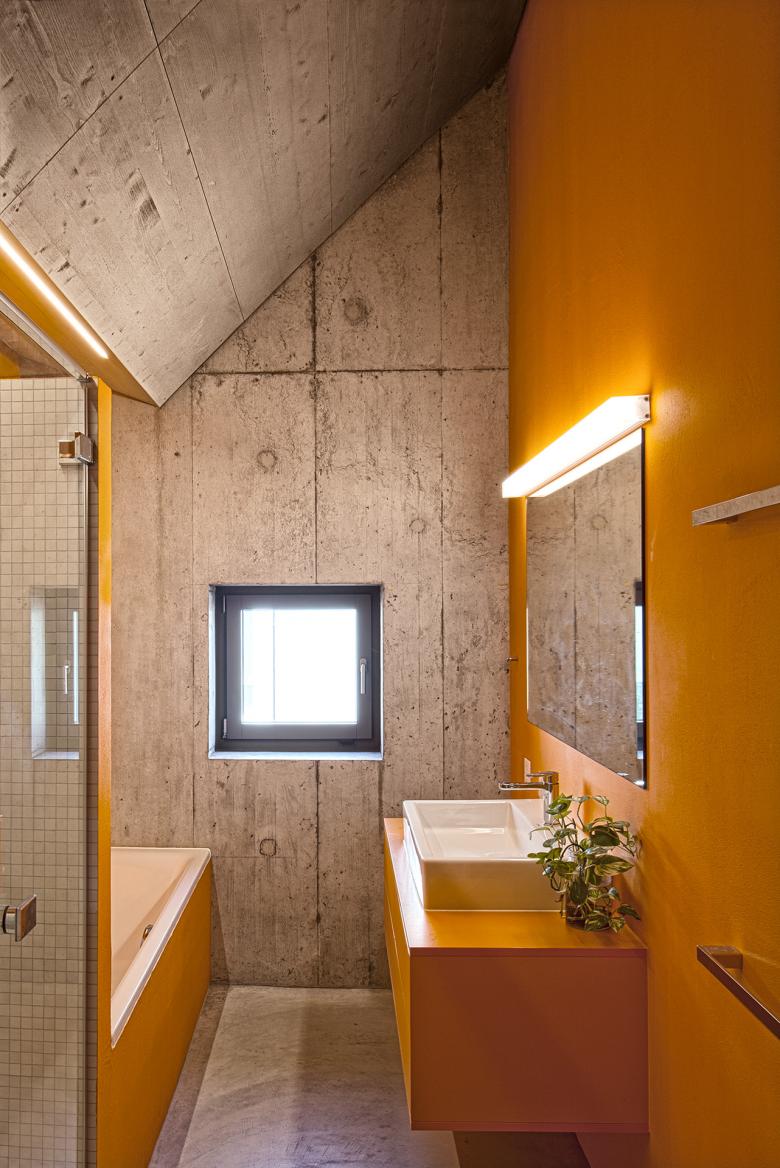 Während die Innenwände gemauert und fein verputzt sind, tragen der Sichtbeton der Aussenwände, die fugenlosen Hartbetonböden sowie die grossen Fensterflächen zur konsequenten Materialisierung aller Einheiten bei.