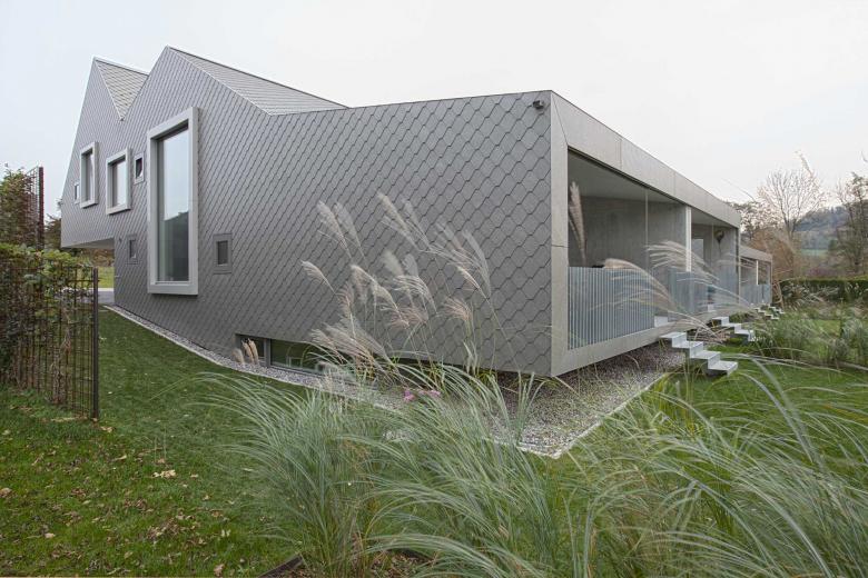 Eine geschuppte Haut aus Faserzementplatten umspielt das gesamte Gebäude.