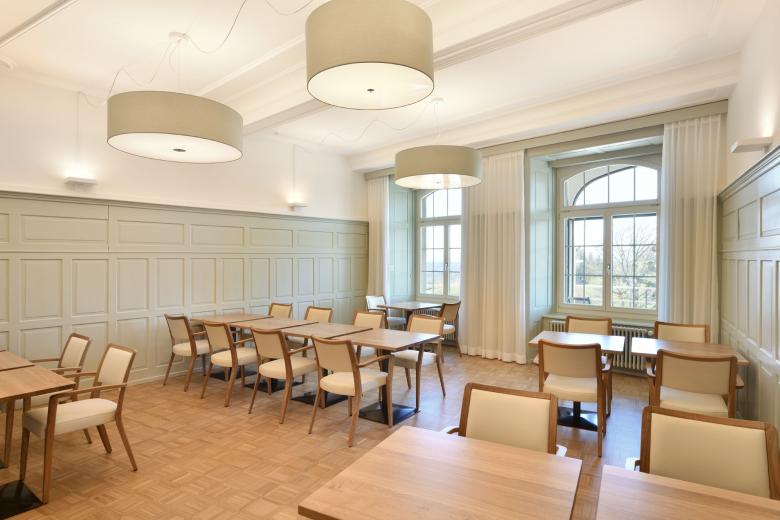 Das rund 450 Jahre alte Riegelhaus wurde im Rahmen einer umfassenden Sanierung behutsam modernisiert. Ziel des Projekts war es, die historischen Qualitäten des Gebäudes zu erhalten und gleichzeitig den heutigen Anforderungen an Komfort, Funktionalität und Barrierefreiheit gerecht zu werden. Zahlreiche kleinere Umbauten aus vergangenen Jahren wurden im Zuge der Arbeiten überprüft und in ein stimmiges Gesamtkonzept integriert. Im Zentrum der Sanierung standen neben den gemeinschaftlich genutzten Räumen wie dem Speisesaal, der Stube und dem Ankunftsbereich im Erdgeschoss, die Bewohnerzimmer. Diese wurden neu strukturiert, teilweise zusammengelegt und mit modernen, den Bedürfnissen eines Wohn- und Pflegeheims angepassten Nasszellen ausgestattet.