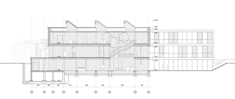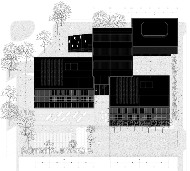 The large raised terrace enters the main spaces of the school, where the energies of the surrounding city converge, common spaces overlook and the public services open to the city find their place. The areas of the central volume, shared by the school and the city, are an access point to culture for all ages. The new volumetric configuration of the complex is accompanied by the transformation of its architectural image. The central volume in painted metal, the gymnasium in exposed brick, the entrance staircase in conglomerate, enter into a dialectic relationship with the pure volumes of the teaching, both treated in an equivalent way: large windows framed by warm wooden frames, floor marker in concrete. The industrious city is mixed with the domestic and reflective dimension of the spaces where to develop the didactic activity.