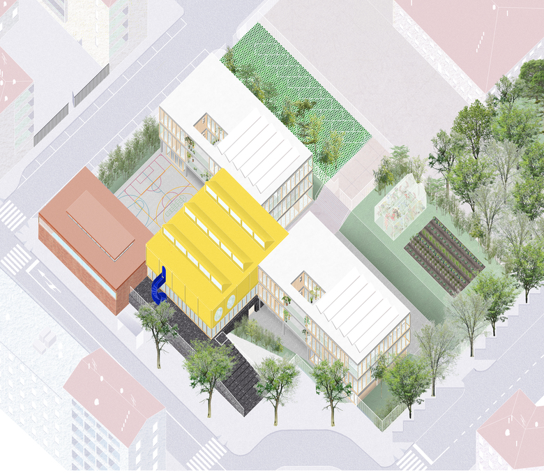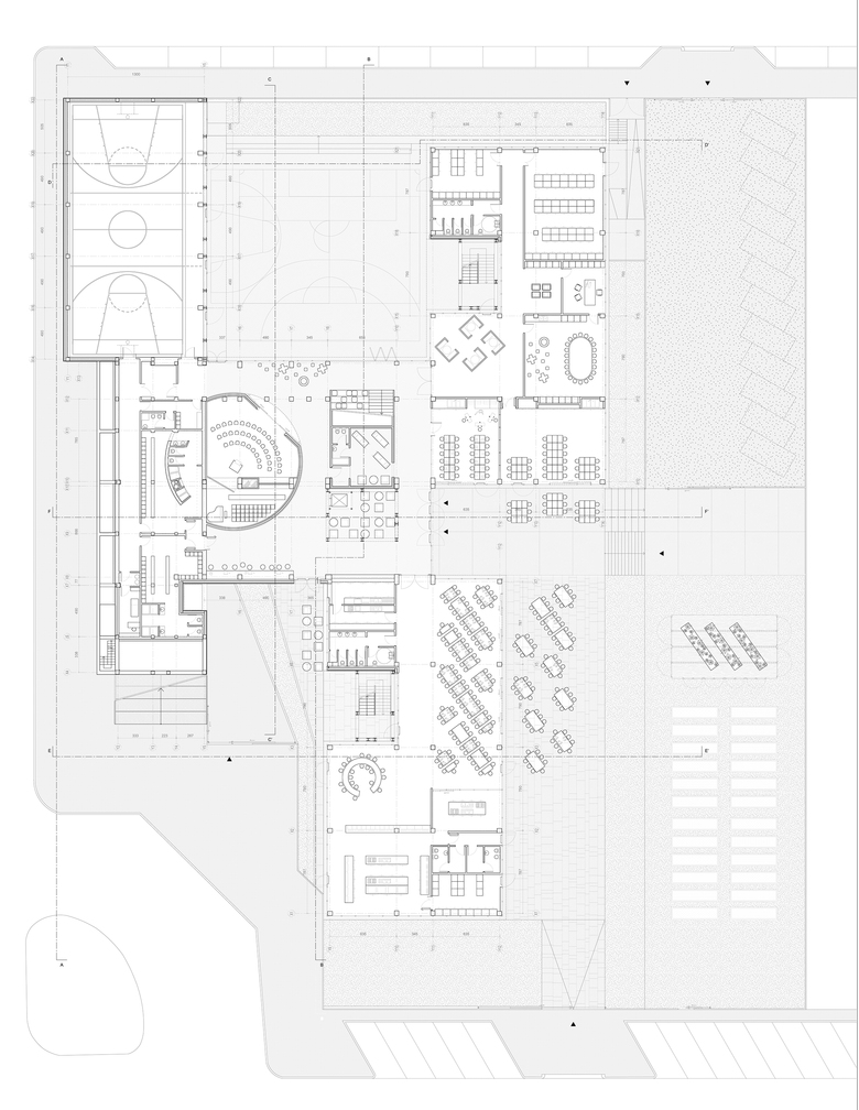 The school transforms itself from a fenced-in, introverted container of knowledge into a dynamic square that attracts the energies of the neighbourhood. A podium raised 1.5 m above the ground level and connected by a wide staircase gives continuity to the public space.