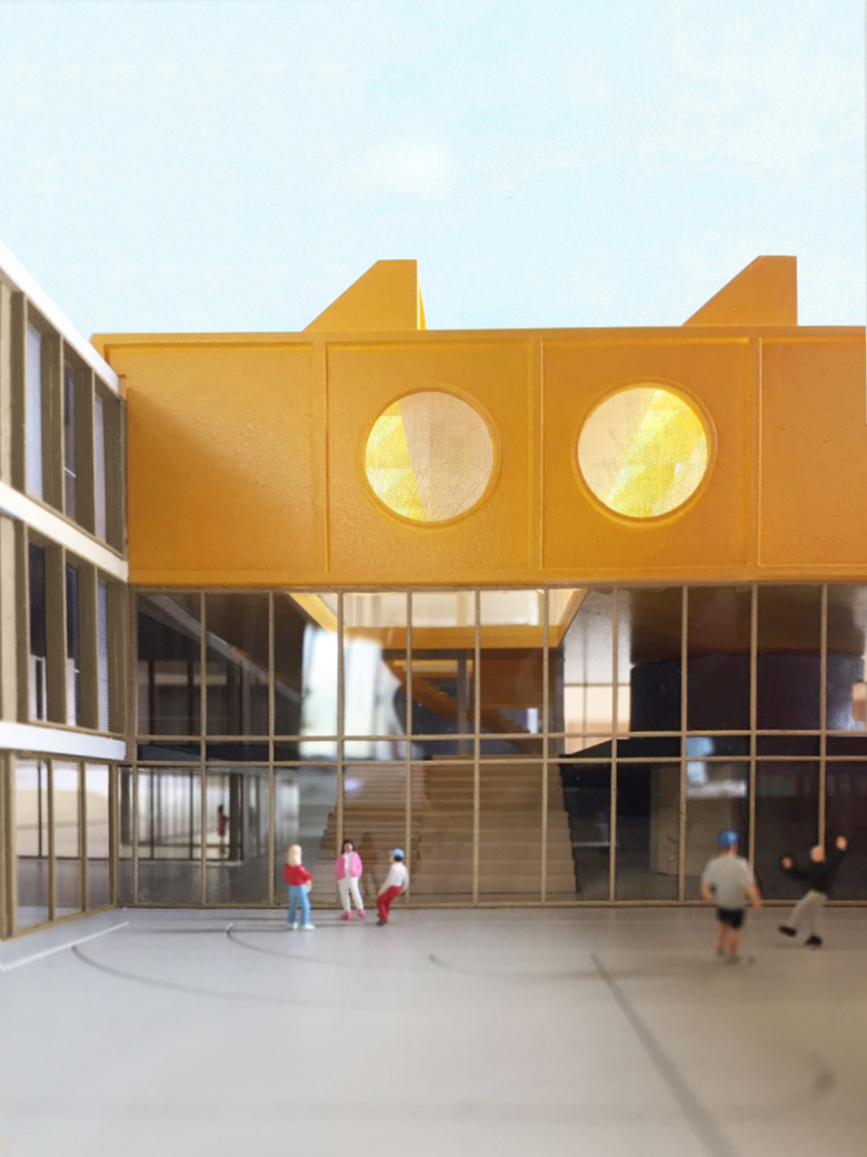 The Enrico Fermi school is located in a strategic point of the city, in an area in which urban transformations have already started with the Lingotto. The district has a strong productive nature and thanks to its position it has been subjected to many innovative changes. However, the actual building occupies the site in an introverted way and remains passive to the surrounding urban system. The demolition of the two access ramps into a single entrance staircase establishes a new relationship with the surrounding city.