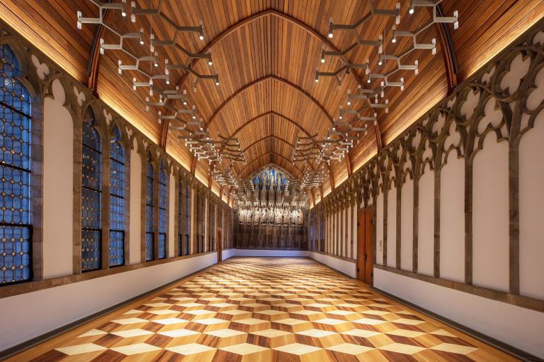 Das glänzende Wabenparkett bezieht sich auf klassische Würfelmuster der Renaissance und lässt die Fläche dreidimensional hervortreten. Die Vergrößerung des Maßstabs als gestalterischer Kunstgriff verstärkt den dramatischen 3D-Effekt und verleiht dem Saal eine zeitgemäße und mutige Aussage, die im leeren sowie im möblierten Zustand Gültigkeit hat.