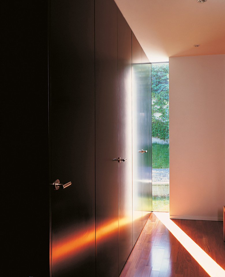 Der Zuschnitt des Grundstücks sowie die zweckorientierte Optimierung der Wohn-Nutzflächen führte zu zwei trapezförmigen Baukörpern. Die Volumen wurden parallel versetzt, sodass sie im Osten einen Zugangshof, im Nordwesten einen Gartenhof definieren. Durch die Kombination von dunkelgrün und dunkelblau gehaltenen Fassaden sind diese Aussenräume farblich spezifiziert. Die Brückenelemente der Eingänge überzeichnen die topografischen Verhältnisse und erhöhen die Privatheit der Einheiten. Auch die ausgeschnittenen hofartigen Öffnungen im Dachbereich gewähren als geschützte Loggien trotz hoher Dichte Privatheit. Die Variation der Grundrisse hatte Einfluss auf die Anordnung und Grösse bestimmter Fenster, und damit auf die Fassadengestaltung. Formal bezeichnend sind reduzierte Details für Dachränder und Fensterbänke. Unterschiedlich tief eingesetzte Fensterflächen entsprechen der räumlichen Situation im Innern sowie der Notwendigkeit, je nach Fall, von Storen-Stürzen. Diese charakterisieren den Ausdruck der Gebäude und relativieren die Kargheit der äusseren Erscheinung.