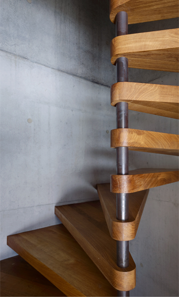 Im Inneren werden jene, in die doppelwandige Betonhülle gestanzten Öffnungen durch breite, wenig wandübergreifende Fenster-Passpartouts aus massiver Eiche zu gerahmten Landschaftsbildern, fokussieren den Blick des Gastes auf die bedeutendsten Bergmassive, sanfte Hangschultern und dichtes Waldgehölz. Neben rohen Betonoberflächen und Böden, Türen und Einbauten aus unbehandelter Eiche ergänzen Flächen aus Schwarzmetall das stimmige, karge Materialgefüge. Kein leichtgewandiges Ferienhaus wurde hier von Bauherren und Architekten geschaffen, sondern eine über Generationen wirksame Rückzugsstätte, bevorstehenden Veränderungen von Klima und Landschaft zum Trotz.