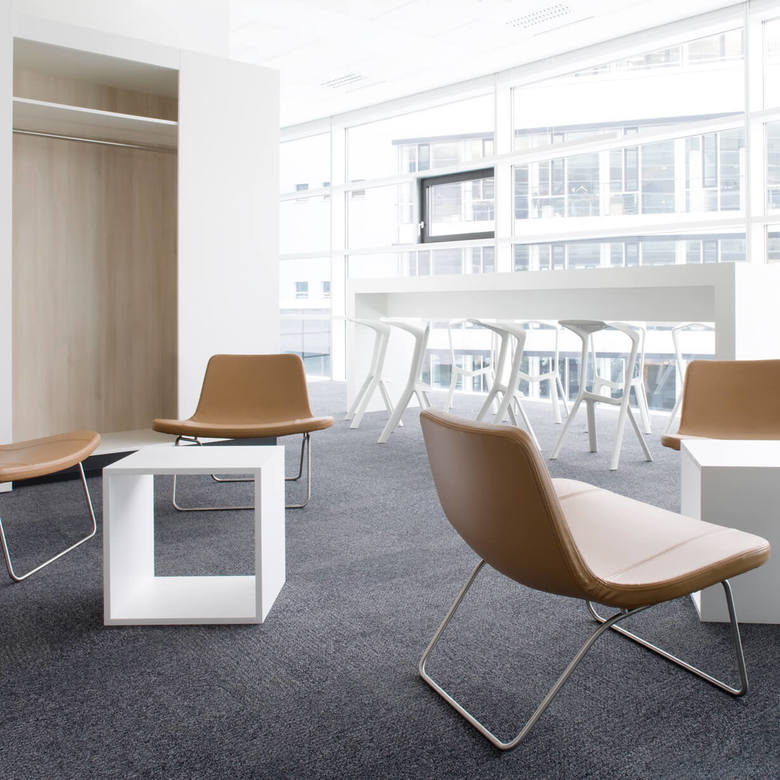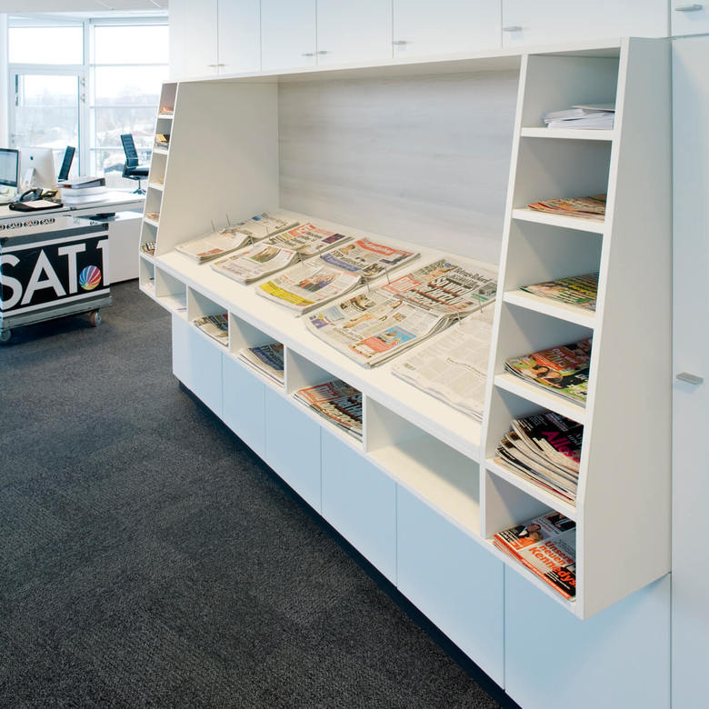 Die planerische Herausforderung: räumliche und akustische Trennung von Bereichen trotz Aufrechterhaltung der wichtigen Sichtbezüge. Durch den Einsatz akustisch wirksamer Materialien für die Büromöbel und die Trennwände, durch eine Höhenstaffelung der Möbel und durch eine spezifische Anordnung der Arbeitsplätze wurde der Großraum zoniert. Die optisch sehr hell und neutral gehaltenen Räume schaffen Ruhe und wirken somit dem hektischen Treiben in der Redaktion entgegen. Und so läuft die Sendung das ganze Jahr über, täglich um 17.30 Uhr.