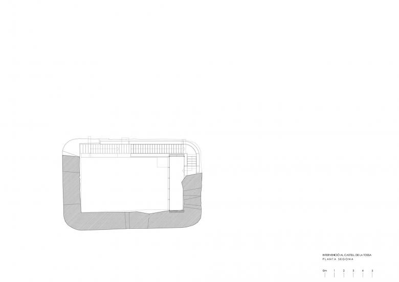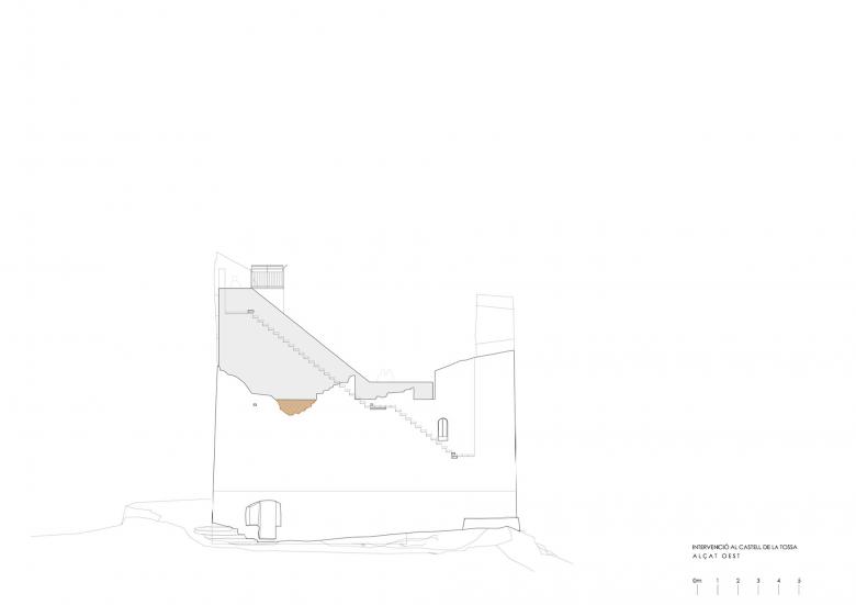 A aquest nivell corresponent a la coberta original, s’hi arriba per l’escala que consolida el mur oest i recupera la idea d’una possible escala original insertada en el gruix dels murs, com és propi de moltes torres d’aquesta època. La forma inclinada de l’escala permet també conservar l’aspecte d’inacabat i per tant la memòria dels enderrocs soferts.