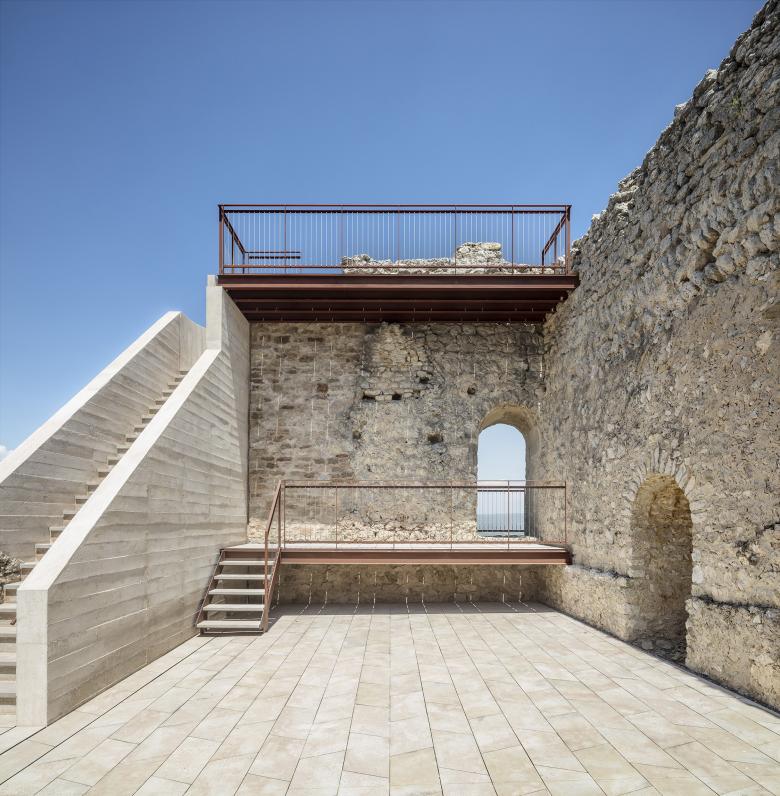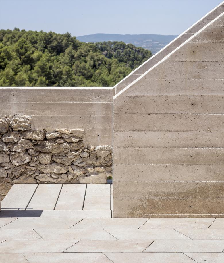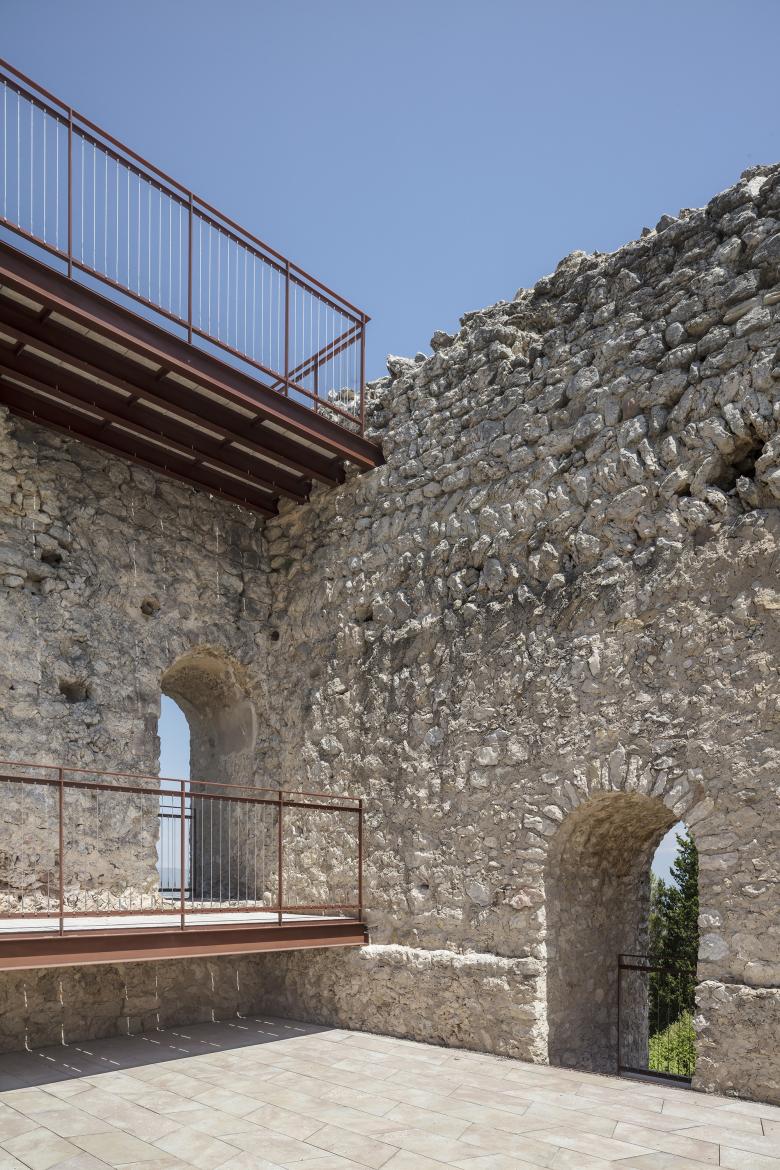Per la consolidació dels murs i la formalització de les escales s’utilitza el formigó de calç en massa per aconseguir la similitud cromàtica i de materials amb l’existent, i armada amb fibres, per aconseguir l’estabilitat estructural obligada per a l’ús públic de l’edifici.