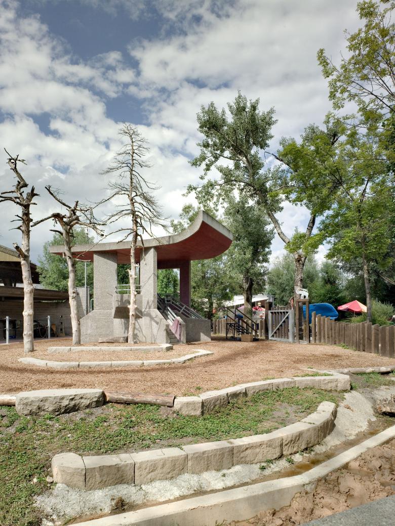 Die Anlage lag vor dem alten Zentralstall mit seinen geschwungenen Wänden und dem weit ausladenden Dach. Diese expressive Betonarchitektur aus den frühen 70-ern wurde in den neuen Anlageteilen tradiert und ihrer Aufgabe entsprechend neu ausgeformt. (Heute bleit einzig der Ponystall Zeuge dieser Zoo-Architektur aus der Gündungszeit des Kinderzoos.)