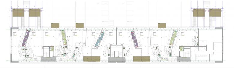 Die ungeordnete Stützenanordnung des Gewerbebaus wird als Qualität betrachtet. Stützen gliedern und bilden Raum. Sie werden ausgespielt, anstatt in Wänden versteckt. Die Wohnungstrennwände knicken sich um die Stützen und teilen die Geschossfläche in zehn gleich grosse Flächen. Diese Wände nehmen die Nasszellen und die Küchenfronten in sich auf, so dass es keiner weiteren Unterteilungen bedarf. Jede Wohnung erhält einen Aussenraum in Form einer Loggia, eines vorgehängten Balkons, oder – wo möglich – einer grosszügigen "Terrasseninsel". Diese liegen auf dem Dach der Anbauten und werden je über eine Treppe erschlossen. Nach der Verwandlung des Büro-/Gewerberaumes in Loft-Wohnungen konnten die Räumlichkeiten sofort vermietet werden.