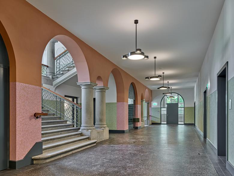 Die heute das Innere prägenden Umbauarbeiten der 70er Jahre zeichnen sich nicht nur durch eine für den Späthistorismus und das Gebäude von Gustav Gull fremde architektonische Formensprache und Materialisierung aus, sondern rauben der Korridorsituation auch auf unverständliche Art und Weise die innenräumlichen Qualitäten: Die grosszügige seitliche Belichtung des Korridors ist durch den muralen Einbau eines zusätzlichen Unterrichtsraums von diesem abgetrennt und hat somit prekäre Belichtungsmomente zur Folge. Unser Vorschlag beabsichtigt daher, in erster Linie die damalige Raumkonzeption des Korridorbereichs wiederherzustellen, in dem die Öffnung zur Befensterung an der Fassade rekonstruiert wird. Gleichzeitig soll sich die ursprünglich formal stark ausgezeichnete Mittelzone mit der Erschliessung und den Sanitärkernen wieder in einer vom restlichen Erschliessungsbereich differenzierten Materialität und Formgebung abzeichnen. Ob dies in ihrer ursprünglichen Ausformulierung möglich sein wird, werden Sondagen zeigen müssen, ansonsten kann diese Stärkung auch mit neuzeitlichen Mitteln, z.B. glänzenden, keramischen Wandplatten, wie sie z.B. beim Brunnenelement vorhanden waren, erfolgen.