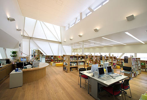 Five large slits pass from north to south through the building, providing for circulation and light penetration. The upper portion of each of these slits, with the exception of the main entrance, is enclosed by a shape inspired by the body of a crane, clad in translucent white panels through which natural light filters into the building. Structurally, the cranes carry the majority of the building's horizontal loads, allowing the south facade of the building to remain open and clear and introducing natural light and ventilation. Staircases running through the five slits provide flexible entry from north side parking, and solar panels placed above act as stationary louvers and help to offset the center is energy consumption.