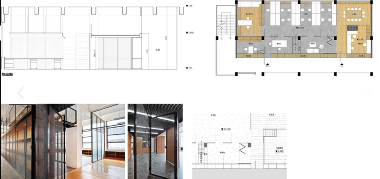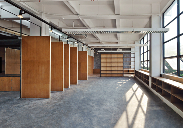 The office, independently designed and renovated by NODE, is located in the East Industrial Area of the Overseas Chinese Town. It was formerly an old factory whose framed structure has been well preserved. Renovation was undertaken to the original structure to make it a new office. Furniture including display shelves, book shelves and doors are used to organize spaces. Different functions are indicated by different ceilings and floorings. Facade materials such as wired glazing, mirrors, meshes and plywood doors effectively not only help divide functional areas but also guarantee clear visibility.