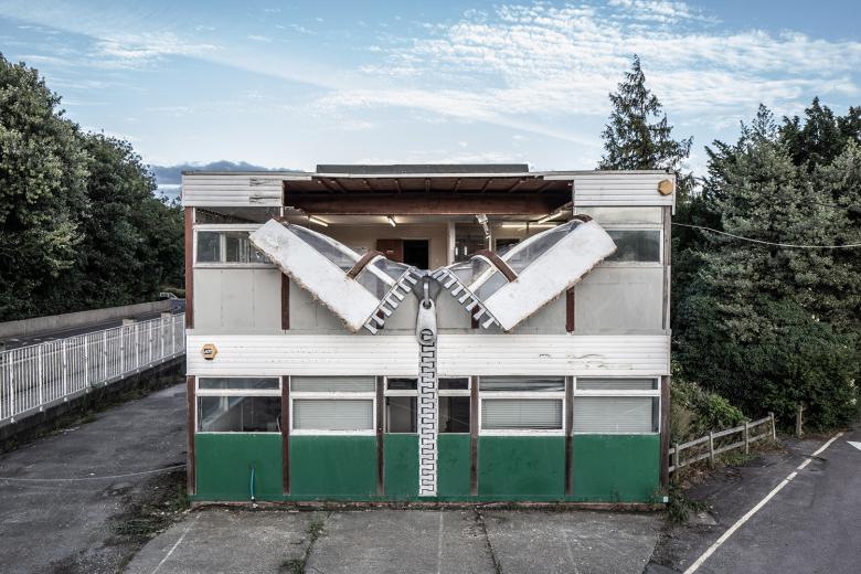 British artist Alex Chinneck has turned a 1960s office building slated for demolition in Ashford, England, into a surprising and humorous piece of art by "unzipping" the facade and allowing passersby to peer inside.