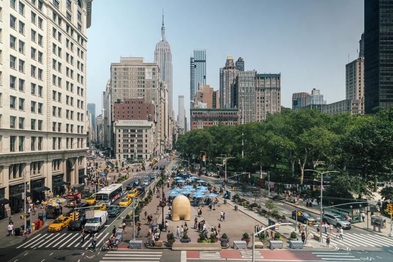 Ahead of his exhibition at the Noguchi Museum in Queens, Spanish sculptor Jorge Palacios has installed Link in a pedestrian triangle next to Madison Square Park in Manhattan. The bulbous wood sculpture sits proudly between the Flatiron and the Empire State Building.