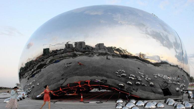 A stainless steel sculpture nearing completion in China's Xianjing region bears a striking resemblance to Anish Kapoor's famous Cloud Gate sculpture installed in Chicago's Millennium Park in 2006.
