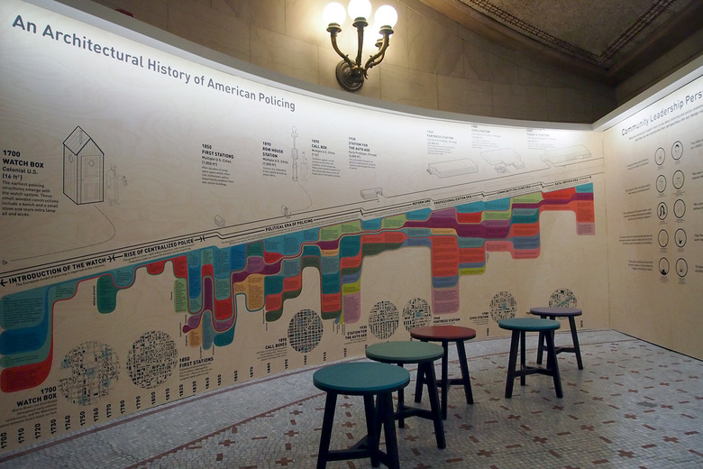 Flanking the grand stairs near the main entrance to the Chicago Cultural Center is Studio Gang Architects' contribution to the Chicago Architecture Biennial: Polis Station, which proposes new ways of integrating police stations into their communities.