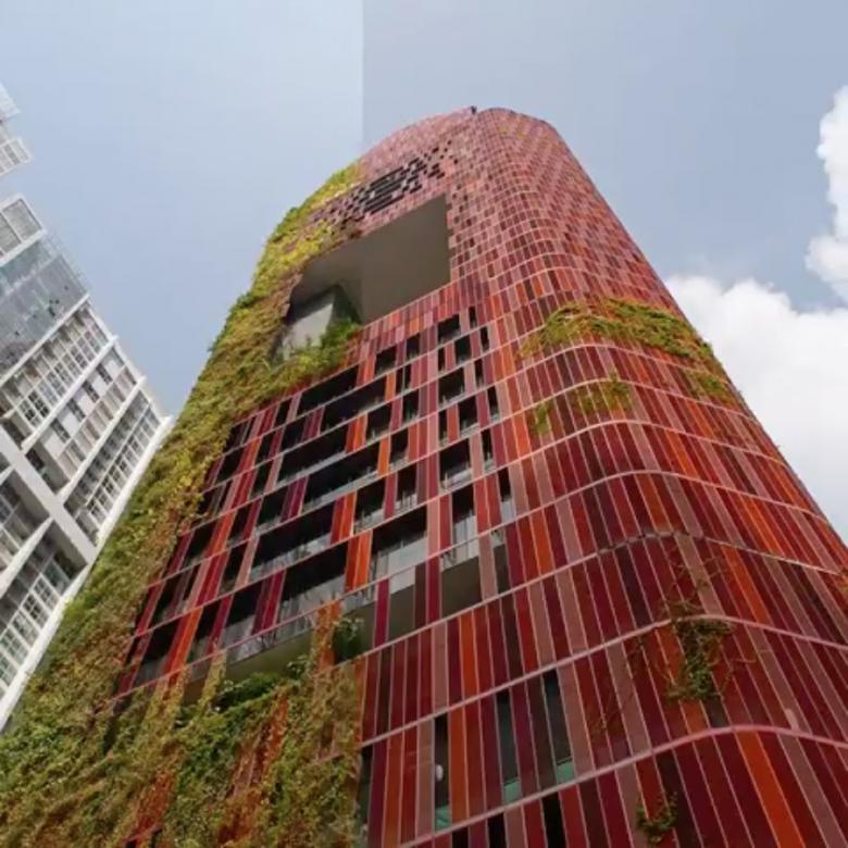 Some recent video footage shot by Keith Loutit shows the phenomenal growth of the creepers taking over the red metal facade of WOHA's Oasia Hotel Downtown in Singapore.