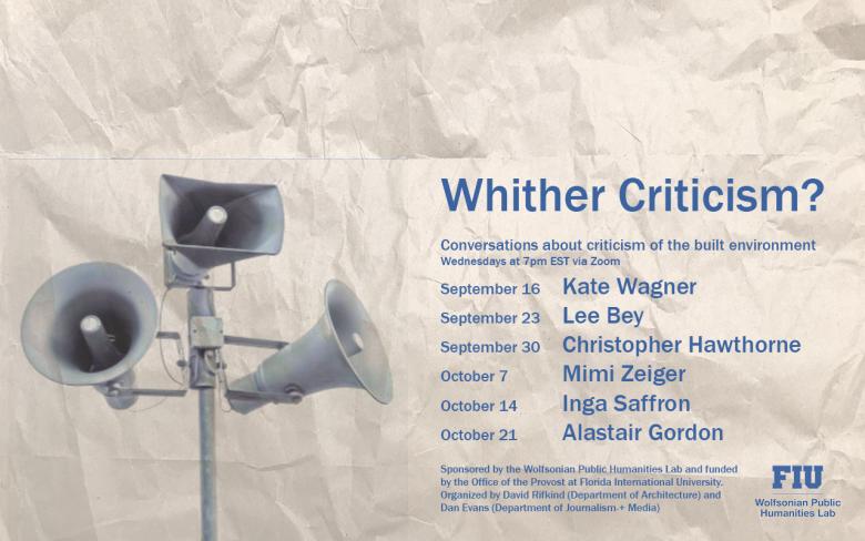 The Wolfsonian Public Humanities Lab at Florida International University is in the midst of its six-part series titled Whither Criticism?, which features live conversations with architecture critics on Wednesdays in September and October.
