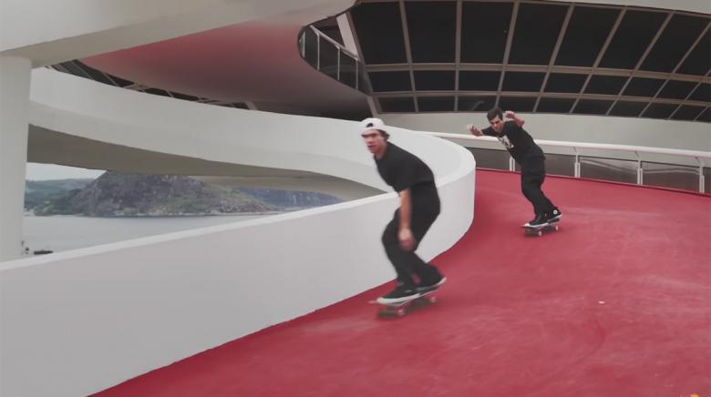 Skateboarders Murilo Peres and Pedro Barros — with a lot of help from Red Bull and the estate of Oscar Niemeyer — were granted permission to skateboard in, under, and atop thirteen of Niemeyer's buildings in Rio de Janeiro, Brasilia, and other parts of Brazil.
