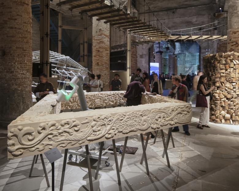 BIG – Bjarke Ingels Group's contribution to Carlo Ratti's Intelligens: Natural. Artificial. Collective. at this year's Venice Architecture Biennale features four wooden beams with intricate carvings made from a collaboration between traditional craftsmen and robots. A short film...