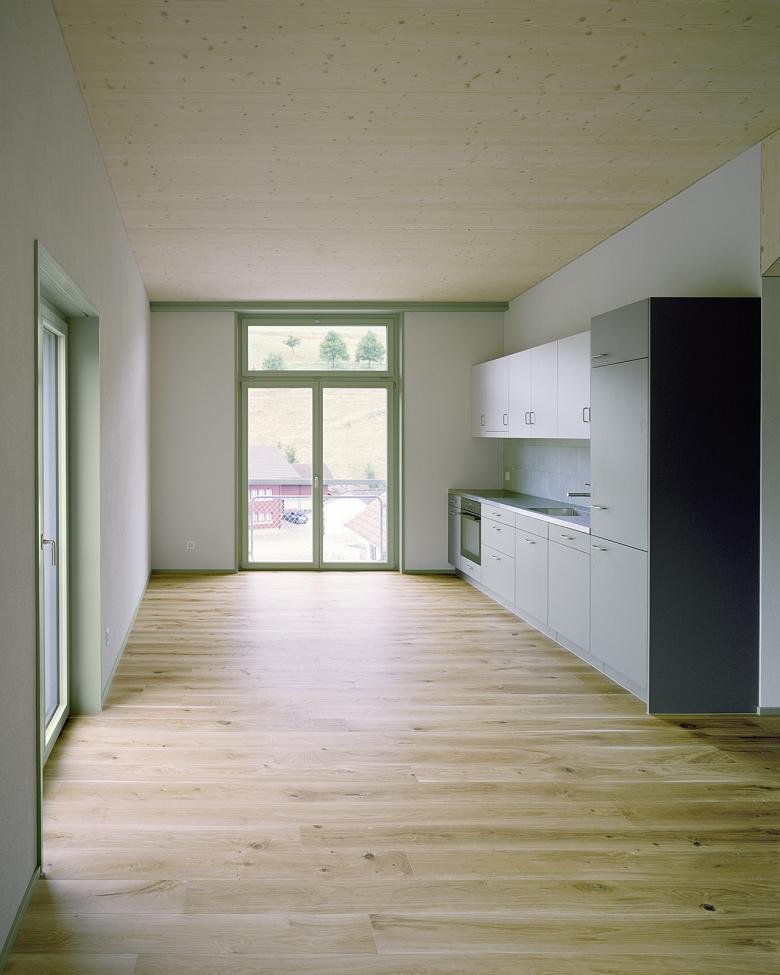 Die ehrliche Konstruktionsweise widerspiegelt sich im Innern, indem die Materialien wo möglich roh belassen sind. Sorgfältige Detaillierungen zum Beispiel in Form von Fensterfuttern, welche sowohl Gestaltungselement als auch eine bauphysikalische Verbesserung sind, zeichnen die Wohnungen aus.