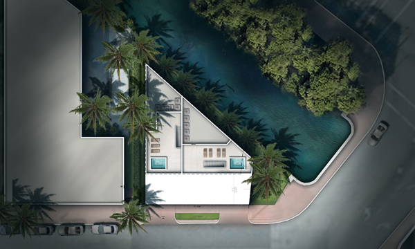 Derived from proportions and scale of the neighborhood buildings, the structure is defined by the restrictions of the site.  The odd shaped site is bordered by one of the original canals of Miami Beach. The rear elevation of the structure sits elegantly along this edge opening up with glass while the front façade is more solid picking up context clues from the adjacent building.