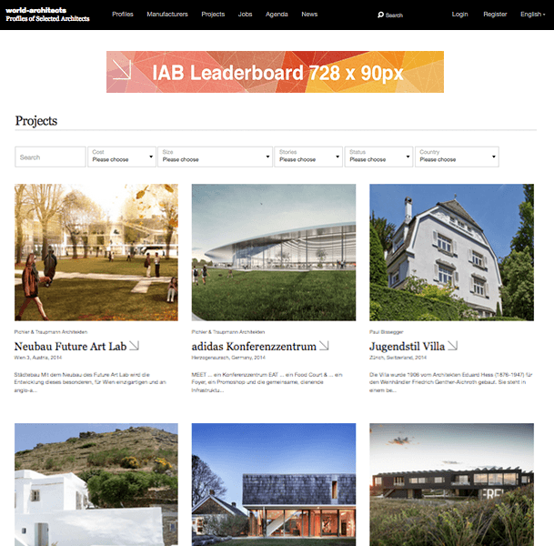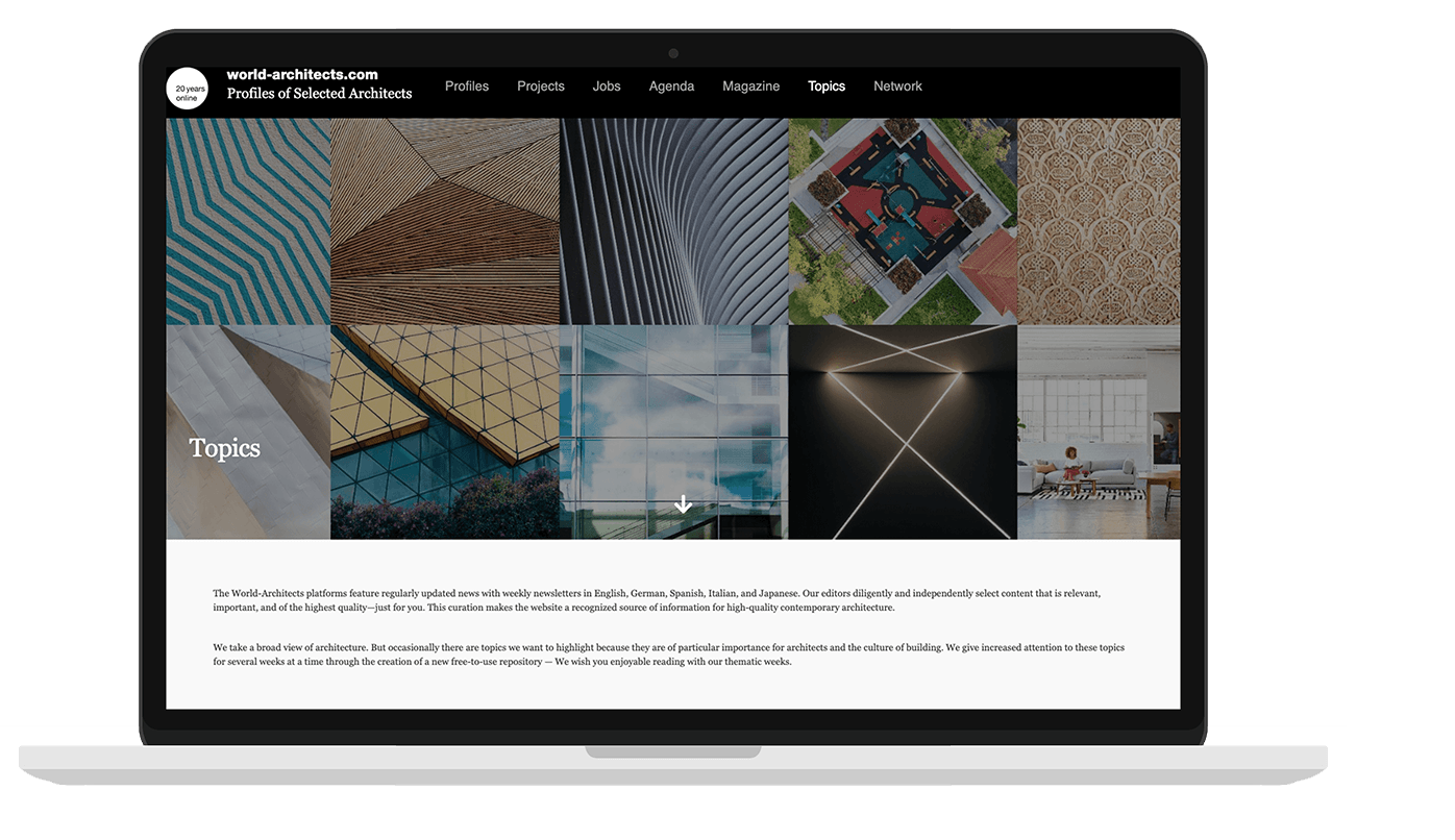 Launched in 1994 by PSA Publishers Ltd in Switzerland, World-Architects pioneered the online publishing of architecture. Today, over 20 online national and regional platforms represent architects, landscape architects, interior designers, engineers, lighting designers, manufacturers, and architectural photographers from over 50 countries.