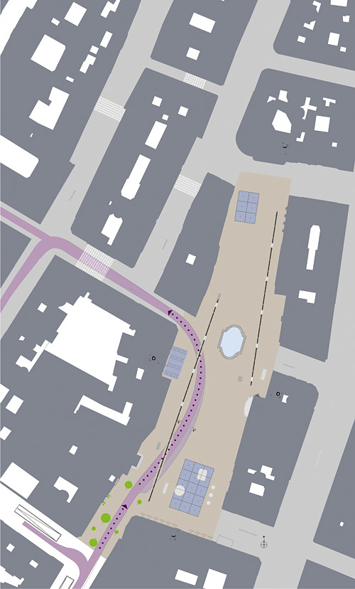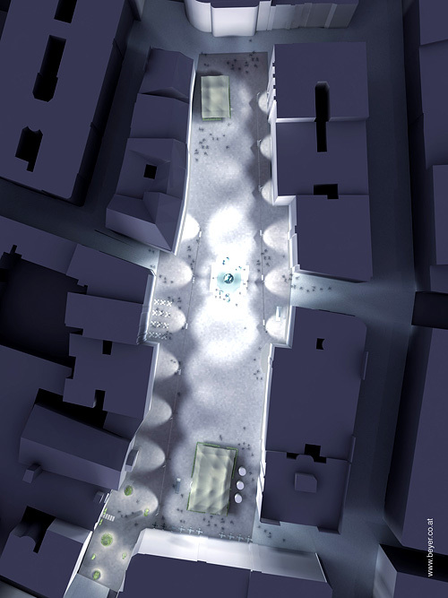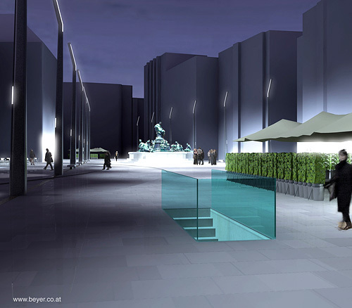 Der Brunnen als Mitte wird verstärkt, da sich an dieser Stelle flankierend die beiden Reihen schlanker Leuchten in einer symmetrischen Raumkonfiguration treffen. Die geforderte Straße wird so geführt, daß einerseits der südwestliche Platzteil mit Kirche und Kapuzinergruft ein maximales Vorfeld erhält und andererseits die Fahrbewegung nicht in einer abrupten 90°Kurve vor dem Brunnen endet. Der Tendenz des Platzes, von Standpunkten im Nordosten nach Süden Richtung Albertina "auszurinnen", wird mittels einer platzräumlichen Installation mit großvolumigen rotationssymmetrischen Grünskulpturen entgegengewirkt, wobei der angestrebte Charakter der einer lustbetonten urbanen Begrünung ist.