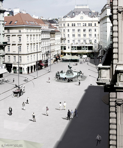 Durch die Konzentration der Schanigärten in zwei kleine Quartiere mit festen Grenzen soll der Großteil des Platzraumes nutzungsfrei bleiben. Ergänzend sind kleine einreihige Tischgruppen den Objekten vorgelagert, vorstellbar. Der Steinbelag ist mit großformatigen Steinplatten in "topstone" Technik vorgeschlagen. Es wird ein heller Granit als ergänzendes Element zu den in Wien vorrangig verwendeten grauen Graniten dem Platz eine weichere barocke Ausstrahlung verleihen. Anordnen der Leuchten und Sitzbänke in linearer Form und Einsatz eines 23 cm breiten Steinbodenfrieses in dunkler Farbe zonieren und rhythmisieren die Freiflächen des Platzes.