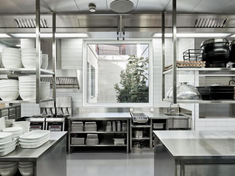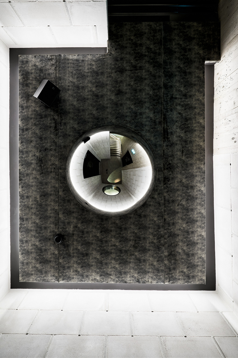 Durch die Fensterfronten an der Langstrasse, der Brauerstrasse und von der Hofseite gelangt Licht in den erdgeschossigen Innenraum und aktiviert je nach Tageszeit das monochrome Deckenkunstwerk aus Veloursteppich des Künstlers Tobias Hantmann. Die Teppichfasern des Deckenbilds transportieren, absorbieren und reflektieren das einfallende Licht sehr unterschiedlich. Es werden damit Farbtöne von silbergrau bis tiefgrün erzeugt, die mit Kunstlicht verstärkt werden können. Grosse, samtbespannte Biegesperrholzobjekte an den Wänden fungieren als sowohl als Sitzmöbel und als auch als weiche Akustikabsorber.