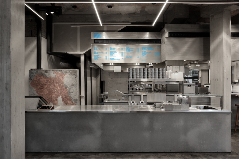 Die im Zentrum positionierte, offene Produktionsküche bildet den Tages- und den Nachtbetrieb im Raumgefüge transparent ab. Die bühnenartig erhöhte Küche ist das eigentliche räumliche und szenische Zentrum. Der Ausbau entwickelt sich aus dieser rechtwinkligen Ordnung und strahlt mit den langen Tischen und Bänken, dem Lichtraster und den Akustikplatten in den geschwungenen Raum. In der Untersicht bilden sich Überlagerungen und an den Raumgrenzen Verschnitte zwischen den Systemen von alt und neu.