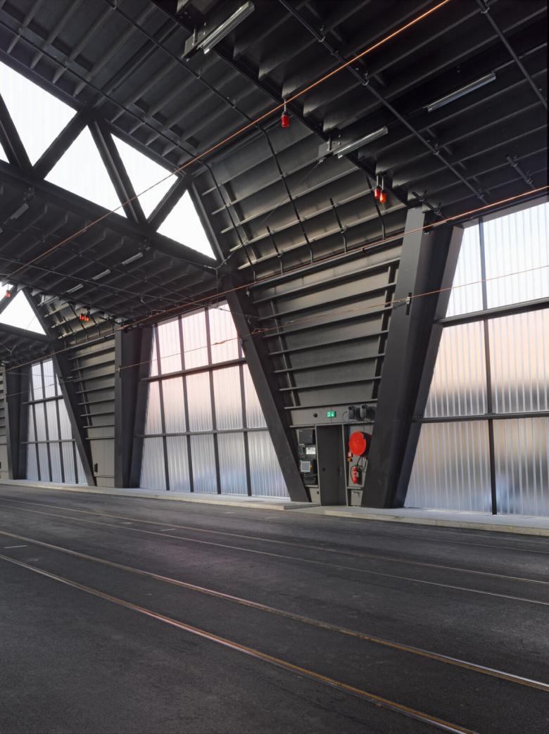 Das äussere Erscheinungsbild der Halle wird geprägt durch die Leichtigkeit der Glas-Aluminiumhülle. Die roten Tramzüge und Signale schimmern schemenhaft durch die transluzente Fassadenverkleidung der grossen Halle. Das aus Linien und Streben zusammengesetzte Tragwerk wird von einer metallisch-gläsernen Hülle überspannt, die dem Bauwerk einen plastischen Ausdruck verleiht.