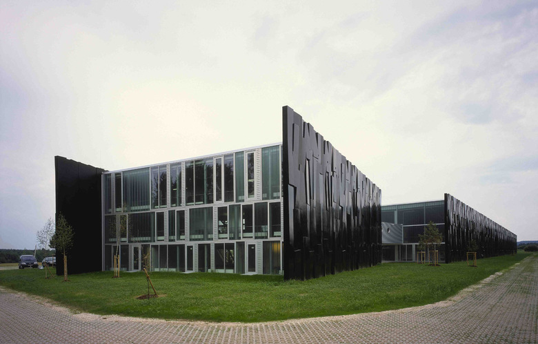 Die neue Hauptniederlassung der Grammer Bürostühle GmbH liegt wie ein Felsen im Bayerischen Wald. Die Fa. Grammer stellt hochwertige Bürostühle und Kinositze in „On-Time“ Produktion her. Das Gebäude Ensemble gliedert sich in eine Produktionshalle und einen Verwaltungsbau (Head-office), die über eine Brücke miteinander verbunden sind. Sie werden flankiert von schwarzen, massiven „Fels“-wänden. Die nach aussen hin grob erscheinende Architektur nimmt hier - im Stil der Landart - Bezug auf die Waldlandschaft. Durch die eingestreuten Anpflanzungen heimischer Hölzer verwachsen die Gebäude mit der Umgebung. Die Kopfseiten erzeugen über durchsichtige und transparente Materialien einen Kontrast, der die Wirkung der strukturierten Wände stärkt. Die Betonfassade umfasst 216 einzelne Tafeln von 10,5 x 2,0 m. Sie stehen auf einem Streifenfundament und sind mit jeweils einem Bolzen an der Stahlkonstruktion der Halle/Büro befestigt. Die freistehenden Elemente an den Kopfseiten sind im Fundament eingespannt. Die schwarze Farbbeschichtung wurde auf den fertig montierten Elementen vor Ort in einem 3-Schicht System aufgebracht. Die Tragkonstruktion der 6.700 m2 grossen Halle besteht aus einer verzinkten Stahlkonstruktion aus Fachwerkträgern und eingespannten Stahlstützen. Die Fachwerkträger wurden aus gefalteten Stahlblechen computergesteuert verschweisst (Filigranträger). Die bauphysikalische Hülle wird mit Aluminium-Sandwich Paneelen hergestellt. Für die Kopfseiten wurde profiliertes Bauglas mit Wärmeschutzbeschichtung in Kombination mit einer eloxierten Pfosten-Riegel Konstruktion eingesetzt.