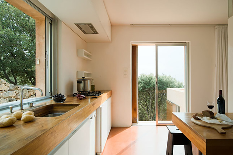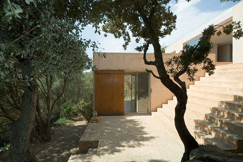 THE HOLIDAY HOUSE SITS AS WALKABLE SCULPTURAL BUILDING IN THE STRONG LANDSCAPE WITH A SQUARE RUIN, OLD RETAINING WALLS, LARGE ROCKS AS WELL AS OLIVE GROVES AND OAK TREE FORESTS. IN THE SOUTH THE HOUSE HAS A SPECTACULAR TERRACE WITH A GREAT VIEW ON THE SEA AND WITH A LOW, BROAD PARAPET (40/70CM). UNDER THE TERRACE IS A FURTHER GUEST ROOM WITH A BATH AND CELLAR. THE LIVING SPACE HAS THE ATMOSPHERE OF A COVERED OUTSIDE SPACE AND GETS MAXIMUM GLAZING ON THE BACK TOO, WHICH RELEASES THE VIEW AS CONTRAST TO THE WIDTH OF THE SEA ON THE BIZARRE ROCK LANDSCAPE LYING DIRECTLY BEHIND. TWO LARGE MOVABLE WALL PIECES LET THE LIVING SPACE WITH KITCHEN AND BEDROOM BECOME A LARGE FLOWING AREA. OUTSIDE THE OVERSIZED STAIRCASE DRAMATIZES THE HILLSIDE SITUATION AND CONNECTS THE GUEST ROOM AND ITS SEPARATE TERRACE WITH THE HOUSE IN A GENEROUS GESTURE.