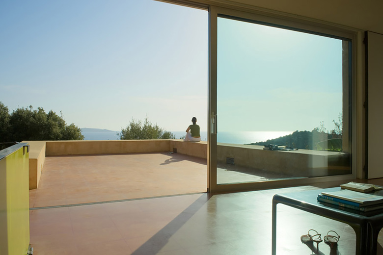 MATERIALS: BRIGHT OCHER LIME FINISH IN THE COLOR OF THE SURROUNDING ROCKS, ALL FLOORS IN SANDED / GRINDED TERRACOTTA SLABS. EXCEPT THE GLAZINGS OF THE LIVING SPACE ALL GLAZINGS CAN BE PUSHED COMPLETELY INTO THE WALLS.