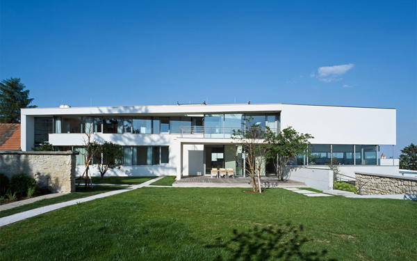 Stadtstruktur, Gartenstruktur und Landschaftsstruktur sind Ausgangspunkte dieses Projekts für gehobenes Wohnen und werden zugleich in diesem verdichtet. Der Baukörper entwickelt sich aus der Längsrichtung der schmalen Hofzeilenhäuser, hebt sich über die steinernen Stützmauern und unterschiedlichen Niveaus einer Gartenanlage und kragt weit aus, um den Blick in die Weite der südlichen Landschaftsebene aufnehmen zu können. Die Anlage wird von einer eigenen Zufahrtsstraße erschlossen und präsentiert sich dem Ankommenden in einer dualen Materialität: Sorgfältig geschalte Sichtbetonwände verhandeln die Berührung mit den sich in das Gebäude hineinziehenden Gartenebenen und schirmen gleichzeitig die Privatheit schützend ab, während eine abstrakte, weiß verputzte Hüllstruktur sich einerseits in der Stadtstruktur verankert, andererseits aber über der Sichtbetonstruktur zu schweben beginnt. Beide Strukturen berühren sich nicht: Durch das offen lassen eines Dazwischen kann der Innenraum ungehindert in den Außenraum fließen und umgekehrt. Lediglich Glas bildet eine thermische Trennung zwischen diesen beiden Räumen. Die Anlage beherbergt drei Wohneinheiten, wovon zwei zu einer Großwohnung zusammengeschlossen sind, und verfügt über einen ausgedehnten Fitness- und Wellnessbereich. Neben den Primärmaterialien der Außenwände Sichtbeton und Putz, die sich als solche auch im Innenraum zeigen, finden weiters innen Holztäfelungen Verwendung, welche Stau- und Nebenräume sowie die Türen zu den Zimmern gleichermaßen homogen verkleiden, um die Klarheit der primären Material- und Raumkonfiguration zu unterstreichen.