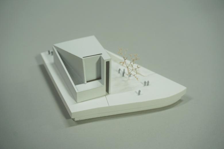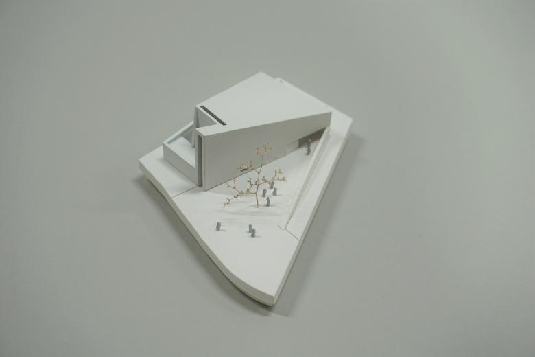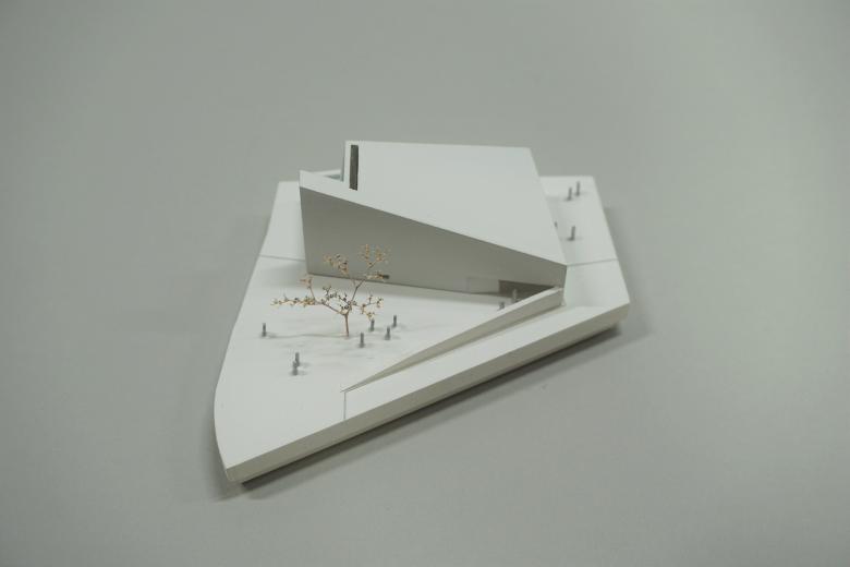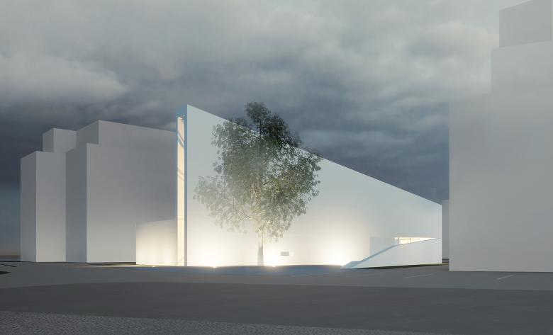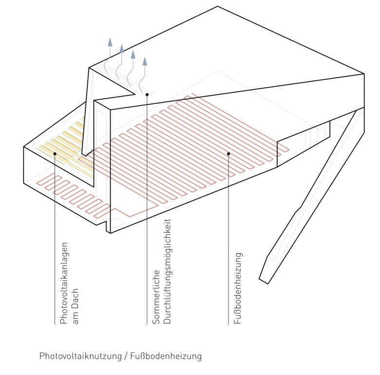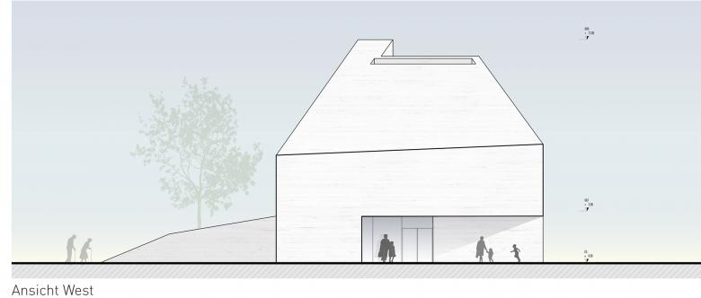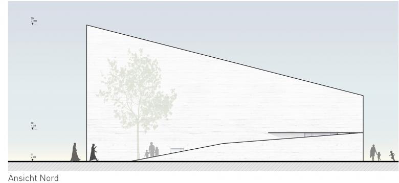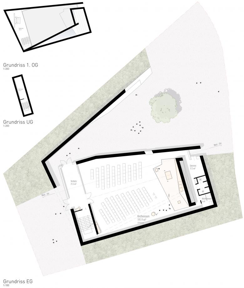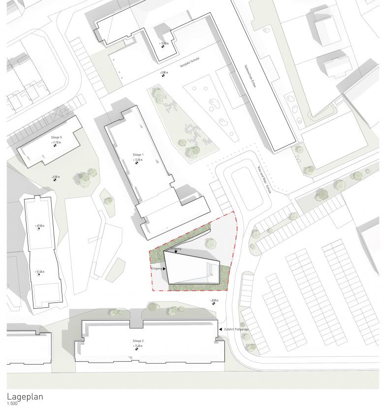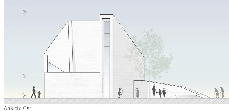 Zunächst sind es die örtlichen Gegebenheiten, auf die der Kirchenneubau reagiert. Da sind die großen öffentlichen Räume des Areals: der zentrale Vorplatz für Schule und Veranstaltung, die Zufahrt mit dem Parkplatz und der parkmäßige Zwischenraum zwischen den Siloobjekten und den anderen Volumina für die Wohnbauten. Allein, um diese Räume miteinander zu verbinden, zeigt sich im Skizzieren eines Netzwerks schon, dass alle Wege irgendwie über den für den Kirchenneubau vorgesehenen Bauplatz führen. So ist es selbstredend, dass der Kirchenplatz dieses Potential des Verbindens aufnehmen und leisten muss.