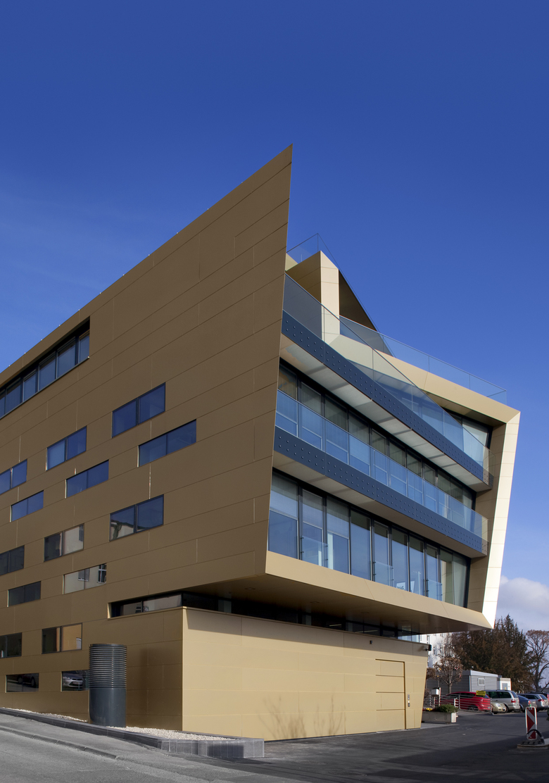 Diese Grundidee - zitiert aus dem Erläuterungsbericht zum Wettbewerbsbeitrag - wurde vertieft und weiterentwickelt. Nach Osten und Westen ist das Gebäude in eine metallische Fassade aus Alucobond-Platten gehüllt, die von einer eigens entwickelten Fensteranordnung perforiert ist. Diese Anordnung ermöglicht ungewöhnliche Ausblicke, bietet den MitarbeiterInnen aber auch eine fast intime Arbeitsatmosphäre und schützt vor Blendung bei der Bildschirmarbeit. Die Größe der Fensterflächen ist auf das notwendige Ausmaß hinsichtlich der Richtlinien für Arbeitsstätten ausgelegt. Es kann damit eine größere geschlossene Wandflächen erhalten werden, die durch ihre bauphysikalischen Eigenschaften (gute Wärmedämmung und gute Wärmespeicherung) zur Optimierung des Energiehaushaltes des Gebäudes beiträgt. Die raumhohen Glasfassaden nach Süden tragen dem großartigen Ausblick in die Wulkaebene Rechnung und können mit regulativen Elementen (Sonnenschutzsystem) die Energie (Solarer Energieeintrag) in das Gebäude hereinlassen oder auch großteils ausblenden.