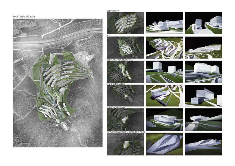 Being the total site area is 200138.6 sqm, Plasma Studio was commissioned the design of a school complex (K12: Kindergarten + Primary + Secondary + High School) and of the University, with four Clusters of Faculties, Residential buildings, Services and Sport Areas. The project, that will be developed in three phases, will be completed in 2037 with the construction of 140.500 m2.