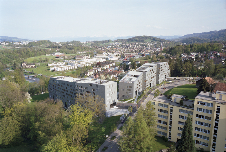 Die Wohnzeilen der beiden Genossenschaften besetzen den nördlichen und westlichen Rand des Grundstücks und zeichnen mit ihrer geschwungenen Dachlinie das Gelände nach. In ihrer Mitte spannen sie einen gemeinsamen Aussenraum auf, der sich zu Aussicht und Besonnung öffnet. Die winkelförmige Lage am Grundstücksrand und die kompakte Bauweise erlaubt einerseits einen maximalen Grünraum, andererseits lässt die Gebäudeausrichtung alle Wohnungen an der Aussicht teilhaben. Ein netzartiges Wegsystem erschliesst die Wohnbauten und geht nahtlos in den öffentlichen Fussweg entlang der Siedlung über. Durch partielle Verbreiterungen der Wege entstehen Plätze und Kleinstplätze mit Aufenthalts- und Spielmöglichkeiten, am Geländefuss wird eine vielseitig nutzbare Rasenfläche angeboten.