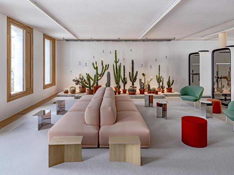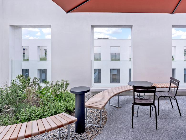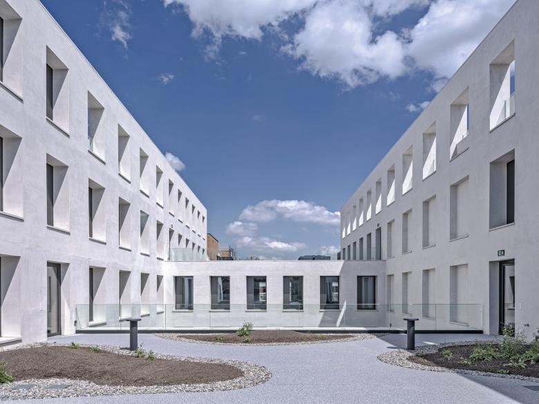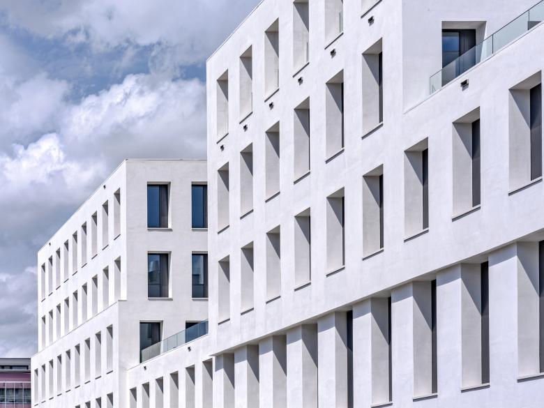 Das Ensemble mit 18.000 Quadratmetern BGF zeigt sich als geschlossener Baukörper mit Einschnitten in den oberen Etagen, die Raum für begrünte Terrassen bieten. Im Parterre sind es die Rücksprünge der Kubatur, die geschützte Freibereiche entstehen lassen. Dem Raumfluss außen steht die maximale Nutzungsflexibilität im Inneren gegenüber. Lediglich Außenwände aus Ziegel, Säulenreihen und die Erschließungskerne bilden eine Primärkonstruktion, die als Rahmenwerk für nutzungsneutrale Arbeitsflächen dient.