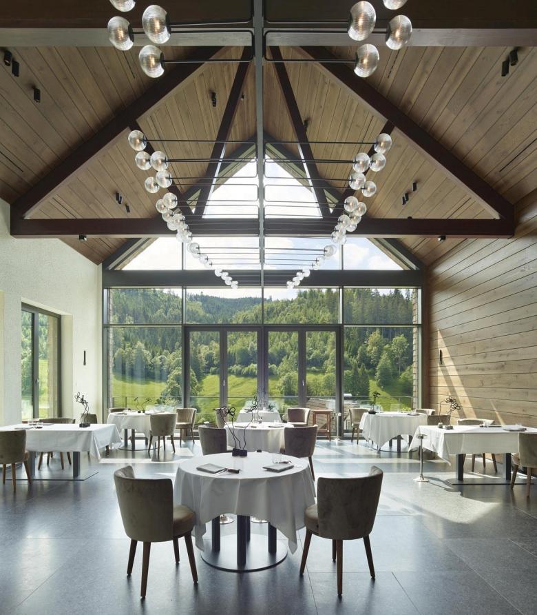 Das Jahr 2020 hat nicht gut begonnen für die Hotelier-Familie Finkbeiner aus dem Baiersbronner Ortsteil Tonbach: Kurz nach Neujahr brannte das historische Stammhaus. Darin befanden sich das Drei-Sterne-Restaurant „Schwarzwaldstube“, das Ein-Sterne-Restaurant „Köhlerstube“ und die Bauernstube – eine schreckliche Nachricht für Familie, Mitarbeiter und alle Gourmet-Fans. Doch nach kurzer Zeit entschied man sich für den Wiederaufbau nach modernen Standards. Die Architektenpartnerschaft ARP aus Stuttgart plante ein Dreigiebelhaus mit knapp 3.000 Quadratmetern über drei Geschosse in Hanglage mit grandioser Aussicht auf den Schwarzwald und das Tonbachtal. Seit der Wiedereröffnung im April 2022 können die Gäste in drei à la Carte-Restaurants auf über 420 Quadratmetern die gewohnte kulinarische Vielfalt des Traditionshotels genießen. Ein moderner Wirtschafts- und Servicetrakt mit zwei neuen Profiküchen inklusive Patisserien, Kühlhäusern und Trockenlagern begeistert vor allem das Team rund um die beiden Sterne-Köche Florian Stolte und Torsten Michel. Darüber hinaus beherbergt der Neubau einen Veranstaltungsraum, Empfangs- und Aufenthaltsräume, helle Büros, eine großzügige Sonnenterrasse sowie eine integrierte Warenanlieferung und Müllentsorgung. Dank der Fassade aus vorpatinierten und für die Schwarzwald-Region typischen Holzschindeln passt der Neubau perfekt zur Architektur der Umgebung.