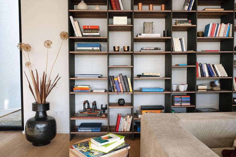 Die Regale des Möbelsystems 7172 erscheinen besonders elegant, wenn die Seitenwände aus lediglich 8 mm starken, aber extrem tragfähigen SWISSCDF-Platten von SWISS KRONO bestehen.